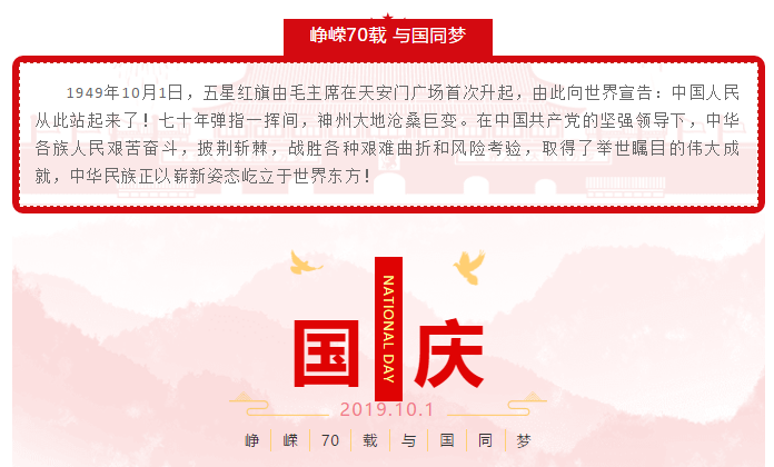 禮贊新中國(guó),奮進(jìn)新時(shí)代!值此中華人民共和國(guó)成立70周年的美好時(shí)刻,讓我們共同祝愿我們偉大的祖國(guó)更加繁榮富強(qiáng)!祝愿我們偉大的人民更加幸福安康